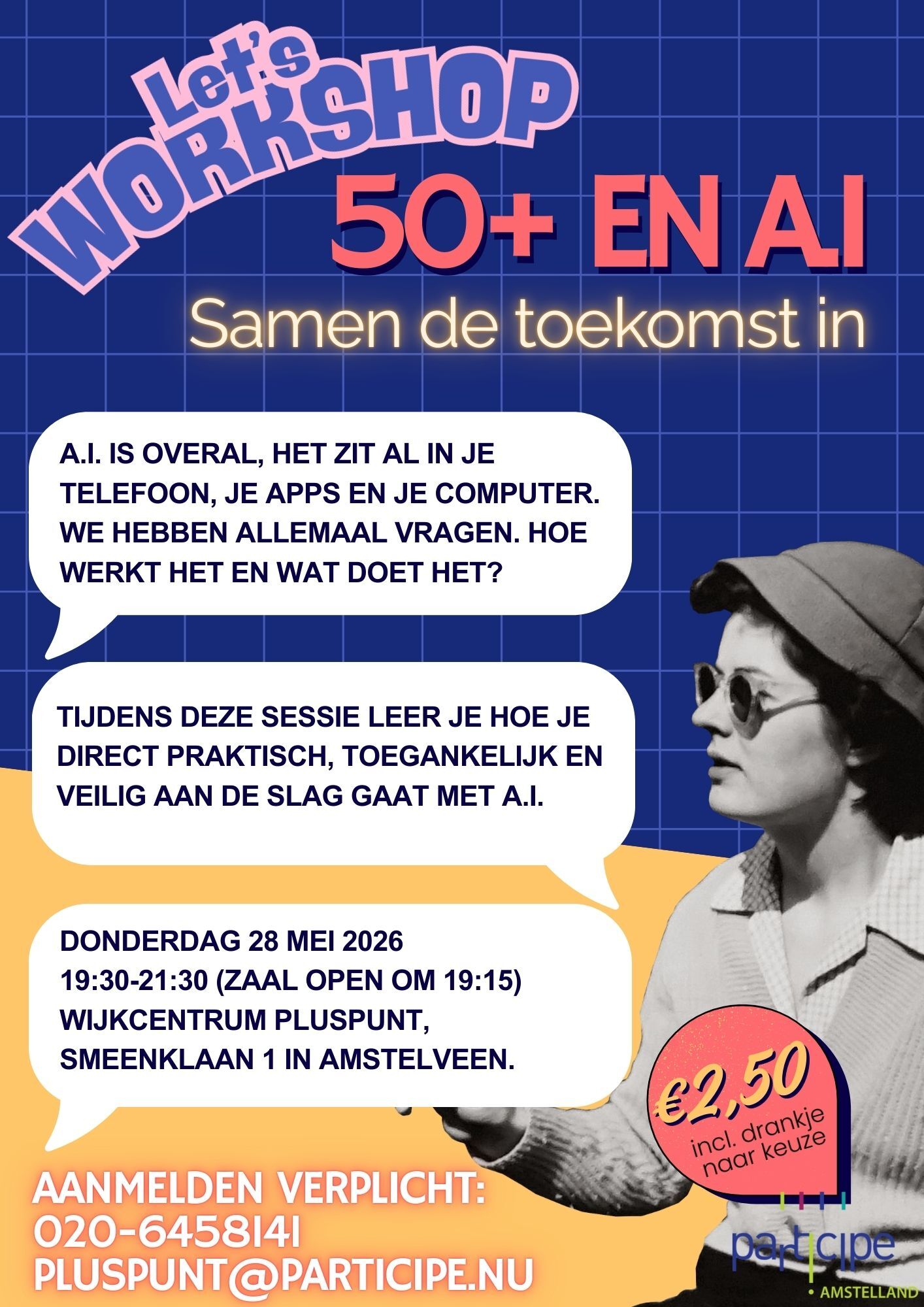 Deze workshop 50+ en AI in wijkcentrum De Bolder willen wij graag met je delen. Het wordt gegeven in het Wijkcentrum Pluspunt. Donderdag 28 mei. Voor meer informatie bel naar 0206458141
