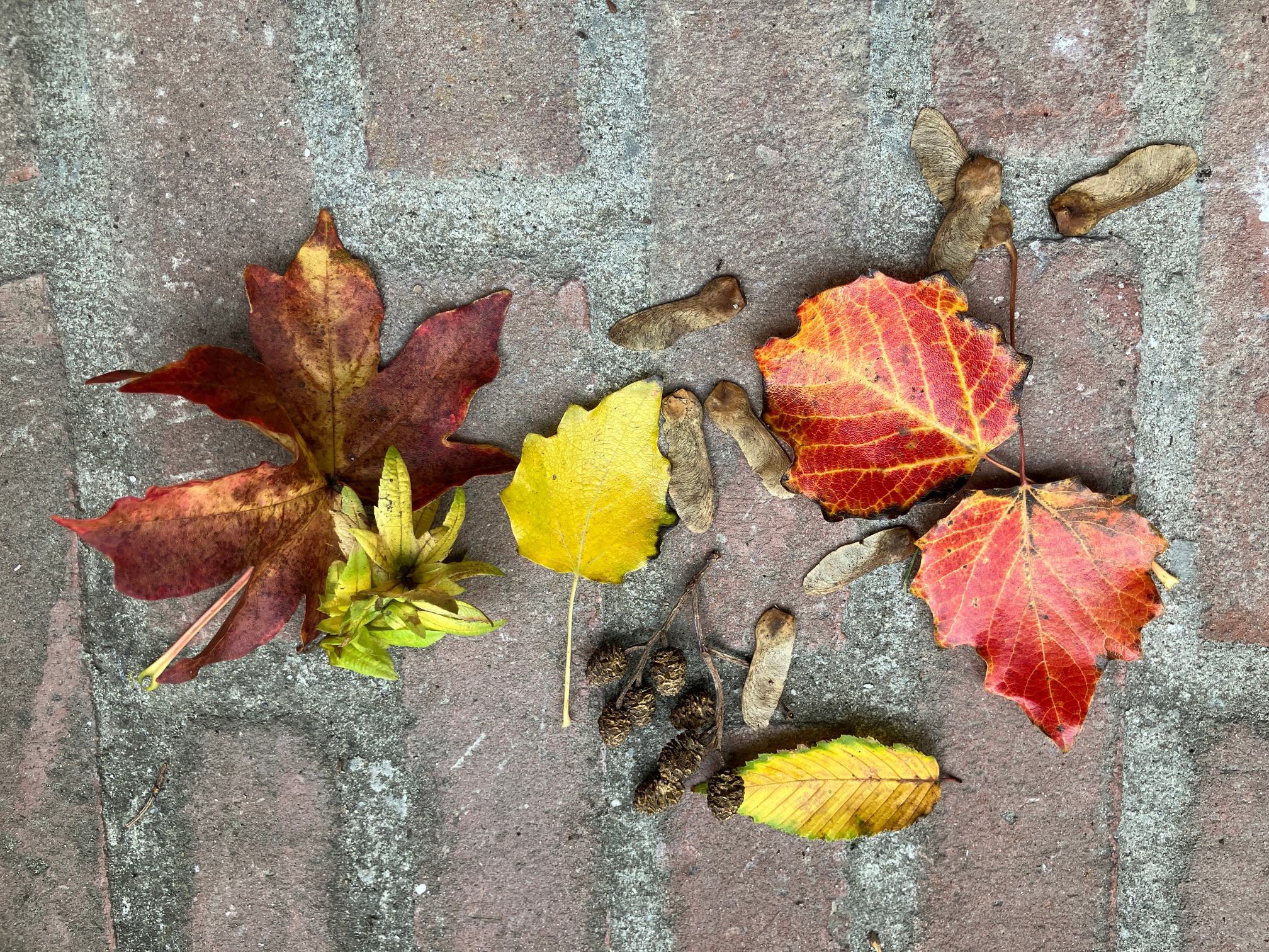 Afgevallen, gekleurde bladeren hebben iets fascinerends. Vroeger verzamelde ik ze en liet ze drogen tussen boeken. Dat moest je dezelfde dag al doen, anders verschrompelden ze alsnog. Wel tussen papieren zakdoekjes of servetten en dan kon je iets van de herfst een beetje vasthouden. Om ze dan lange tijd daarna terug te vinden in het boek, allang vergeten.