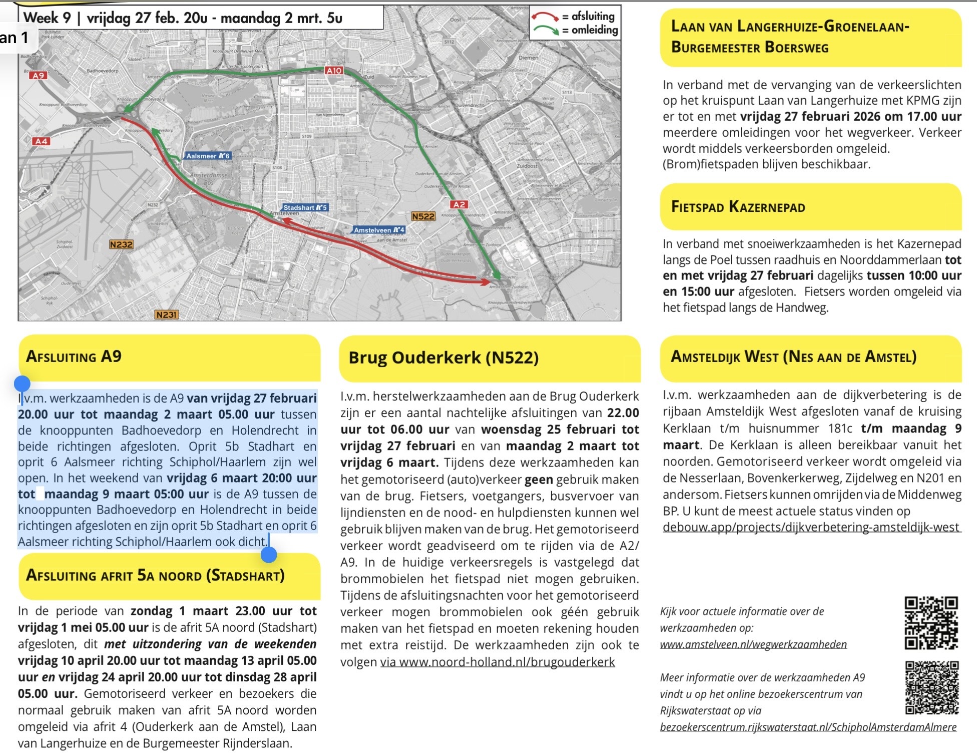 A9 Amstelveen wegwerkzaamheden en afsluitingen