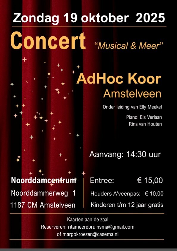 Adhoc koor 19 oktober om 14.30 uur in Noorddamcentrum. Dirigent, pianisten en ensemble die het AdHoc gaan begeleiden zijn van de Concertina's.