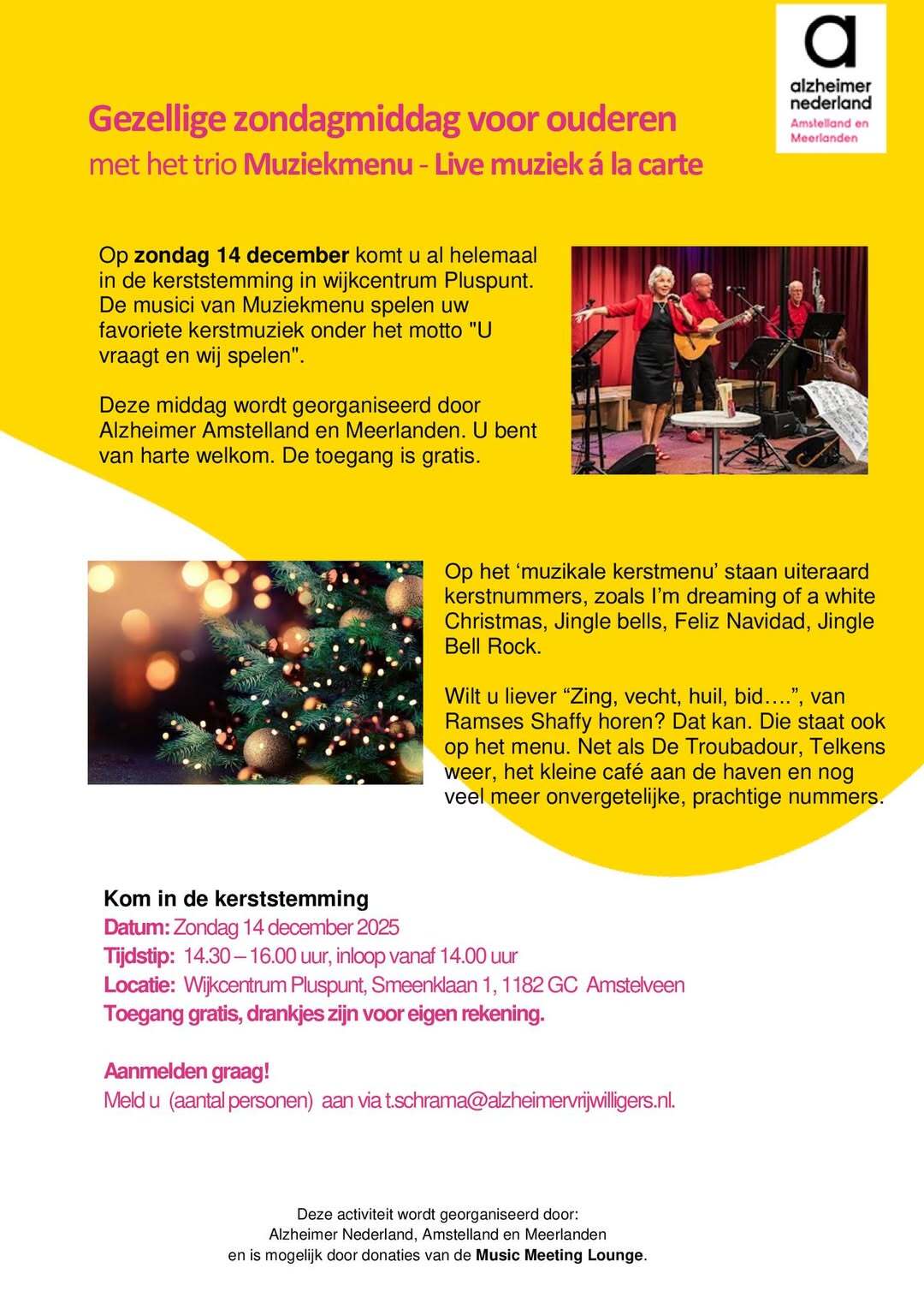 Datum: Zondag 14 december 2025 Tijdstip: 14.30 – 16.00 uur, inloop vanaf 14.00 uur Locatie: Wijkcentrum Pluspunt, Smeenklaan 1, 1182 GC Amstelveen Toegang gratis, drankjes zijn voor eigen rekening.