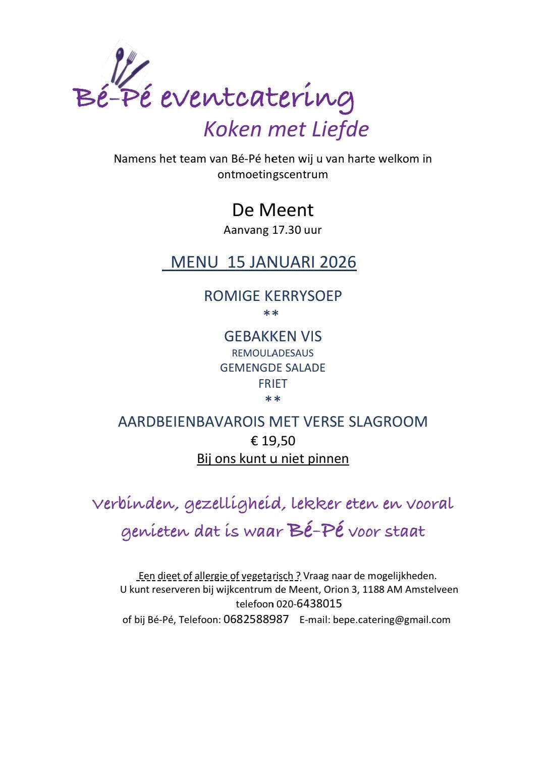BéPé, koken met liefde: donderdag 15 januari 17.30 uur. BéPé verzorgt weer een heerlijk driegangendiner bij ons. De kosten zijn € 19,50 per persoon, u kunt contant betalen (u kunt niet pinnen!) op de avond zelf bij Bé-Pé.