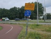 De tijdelijke, gele waarschuwingsborden langs het fietspad van de N522 tussen Ouderkerk aan de Amstel en Amst...