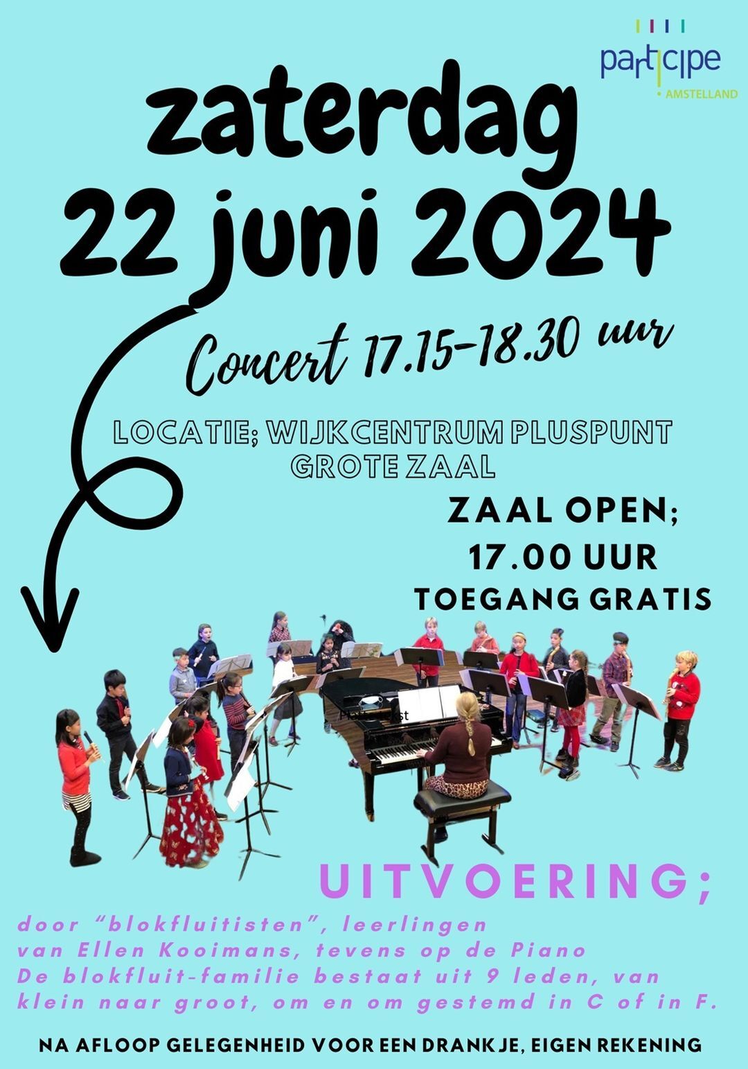 Zaterdag 22 juni van 17.15-18.30 uur Jonge blokfluitisten, onder begeleiding van docente Ellen Kooimans (tevens op de piano), zullen prachtige werken ten gehore brengen.