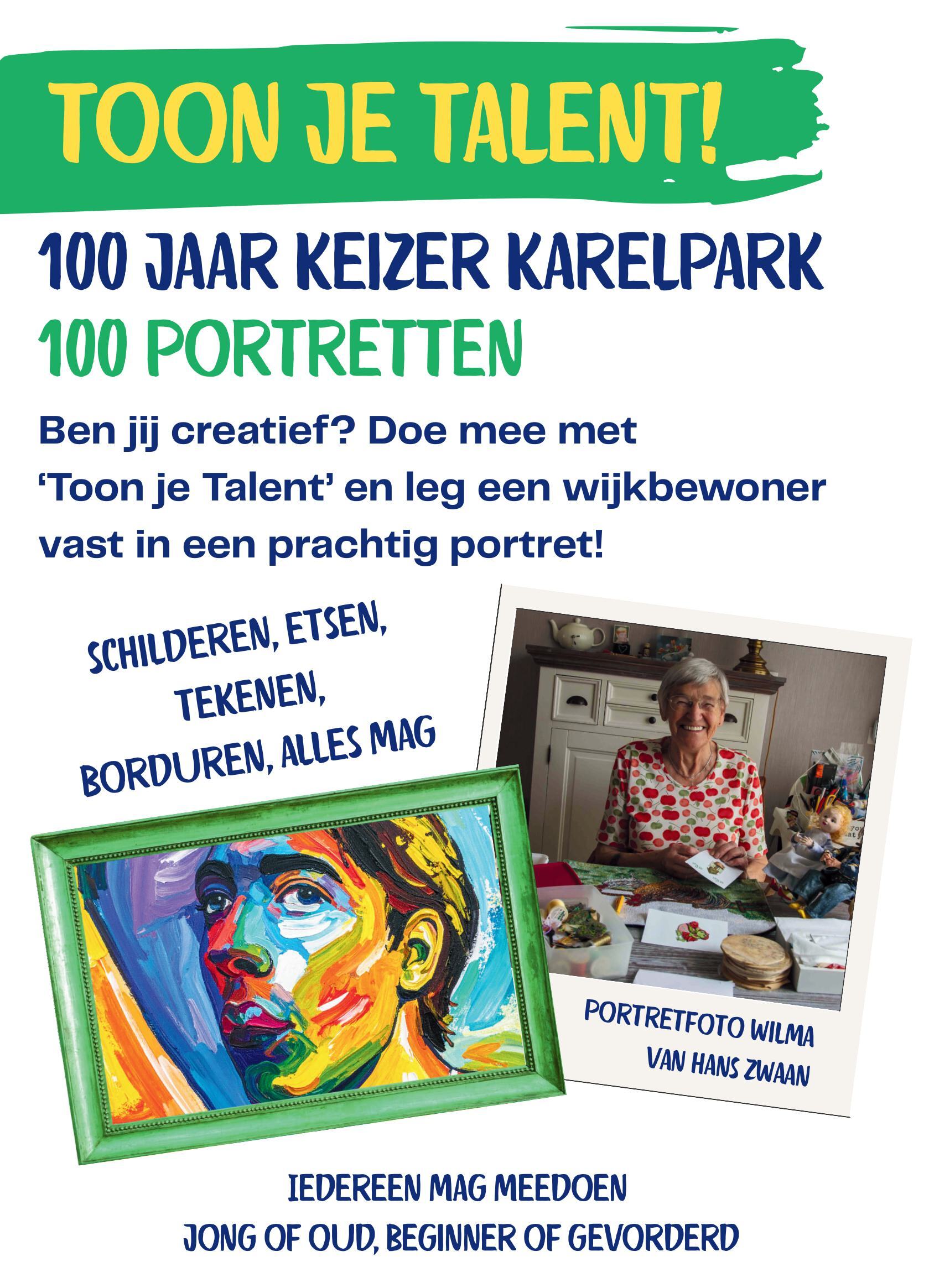 Bron: Maureen van Munster Ben jij creatief en hou je van tekenen, schilderen, fotograferen of werk je met een ander materiaal? In 2026 bestaat Keizer Karelpark 100 jaar en dan willen we een portrettentoonstelling voor en door wijkbewoners maken. • Alle materialen en technieken mogen worden gebruikt (fotografie, verf, textiel, garen, klei, borduurwerk, etc). In de eerste week van juni 2026 willen we de portretten tentoonstellen. Je kunt je aanmelden bij het platform Keizer Karelpark: platform@keizerkarelpark.com Kunstenares Laila Meliani geeft 6 februari om 19.00 uur in de Buurtkamer Keizer Karelpark, Lindenlaan 75, een lezing over portretten. Kijken naar de ander is de basis van het maken van portretten. Hier gaat Laila op in tijdens haar lezing. De toegang is gratis.