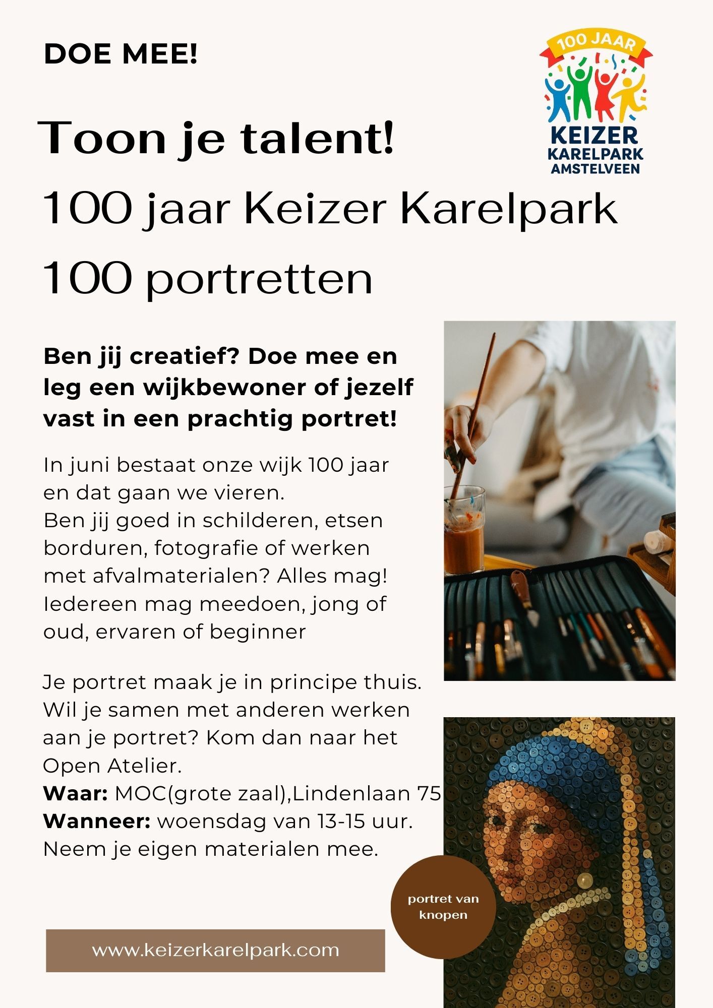 Bron: Maureen van Munster Ben jij creatief en hou je van tekenen, schilderen, fotograferen of werk je met een ander materiaal? In 2026 bestaat Keizer Karelpark 100 jaar en dan willen we een portrettentoonstelling voor en door wijkbewoners maken. • Alle materialen en technieken mogen worden gebruikt (fotografie, verf, textiel, garen, klei, borduurwerk, etc). In de eerste week van juni 2026 willen we de portretten tentoonstellen. Je kunt je aanmelden bij het platform Keizer Karelpark: platform@keizerkarelpark.com Wil je samen met anderen werken aan je portret? Dat kan op woensdagen tussen 13.00 en 15.00 uur in het MOC (grote zaal).