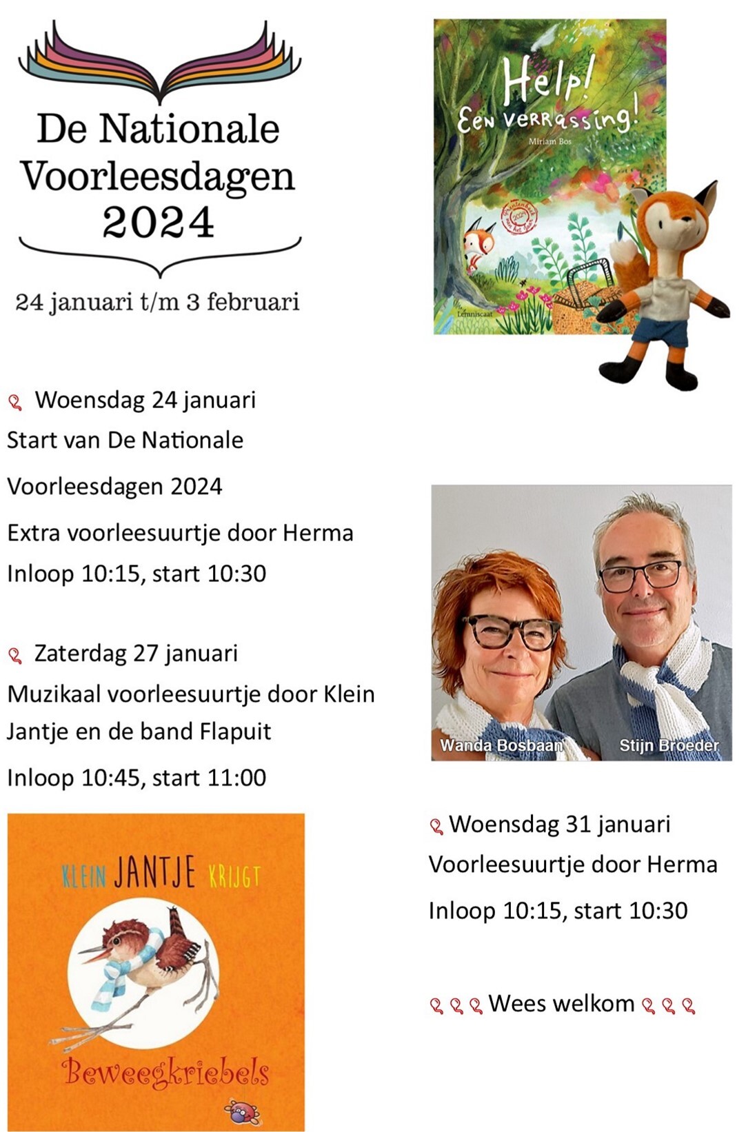 Januari is traditiegetrouw de maand waarin de Nationale Voorleesdagen van start gaan. In de bijlagen is meer informatie te vinden over wat er bij Blankevoort gebeurt in het kader daarvan. Op woensdag 24 en woensdag 31 januari is bijvoorbeeld onze hoogsteigen voorleeskampioen Herma van Zutphen om 10.30 uur van de partij, en op zaterdag 27 januari om 11.00 uur is er een muzikaal voorleesuurtje rond Klein Jantje met Wanda Bosbaan & Stijn Broeder en een optreden van de band Flapuit.