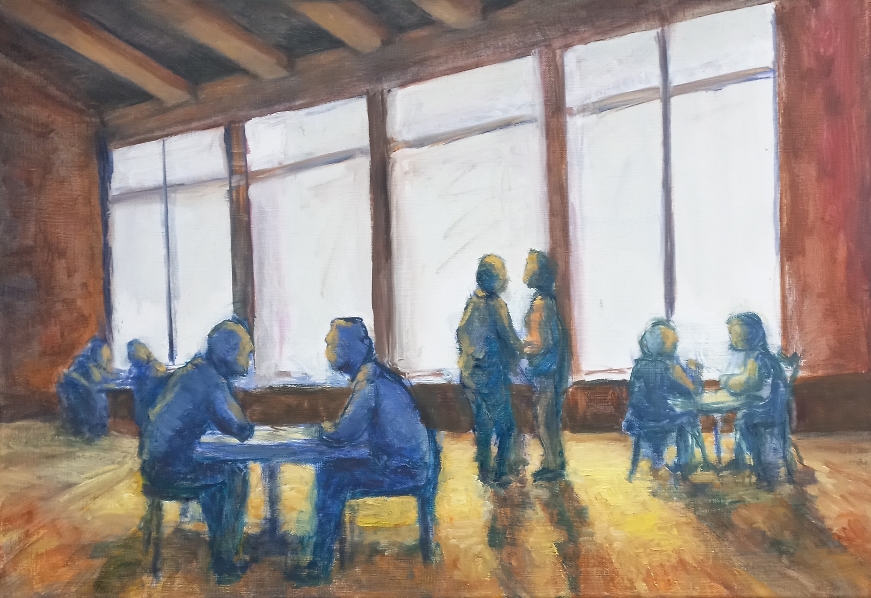De combinatie interieur en lichtval heeft Tineke geïnspireerd tot het maken van een serie schilderijen. En al schilderend komt zij op een nieuw idee voor een volgend schilderij.