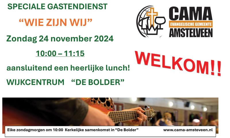 De CAMA Gemeente Amstelveen organiseert op zondag 24 november 2024 om 10.00 uur een gastendienst in het wijkcentrum De Bolder, Groenhof 140, 1186 EX Amstelveen. Het thema van de gastendienst is “Wie zijn wij”. De gastendienst is een gezinsdienst, dus kinderen zijn van harte welkom!