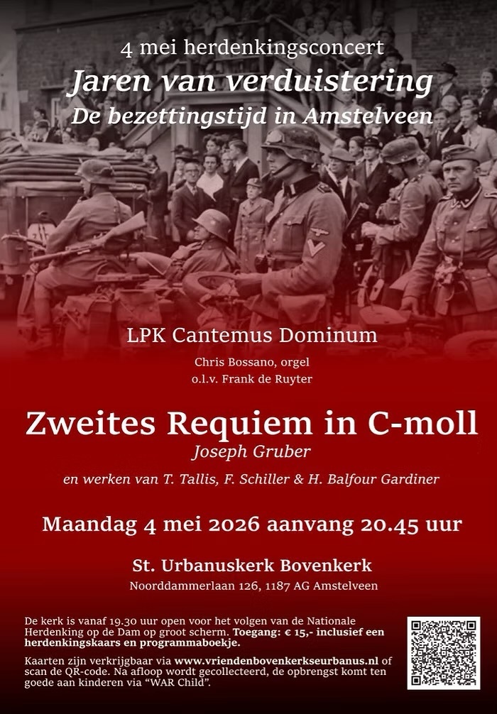 4 mei om 20:45 uur, na de dodenherdenking, vindt in de St. Urbanuskerk in Bovenkerk een bijzonder herdenkingsconcert plaats. Het Latijns Parochiekoor Cantemus Dominum zet hiermee een traditie voort die sinds 2012 bestaat. Voor het eerst wordt het concert dit jaar georganiseerd in de Urbanuskerk, waar het koor sinds begin 2026 zijn thuisbasis heeft. Het concert sluit aan op de herdenkingsplechtigheden van de avond en biedt bezoekers een moment van bezinning, met muziek en verhalen die herinneren aan de jaren van de Tweede Wereldoorlog.