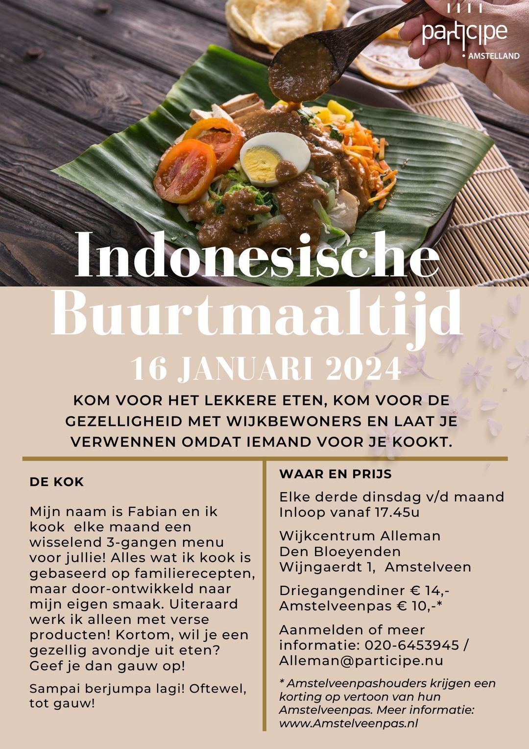 16 januari kunt u weer genieten van een heerlijke Indonesische 3-gangen maaltijd in Wijkcentrum Alleman. Aanmelden kan via 0206453945 of mail naar alleman@participe.nu
