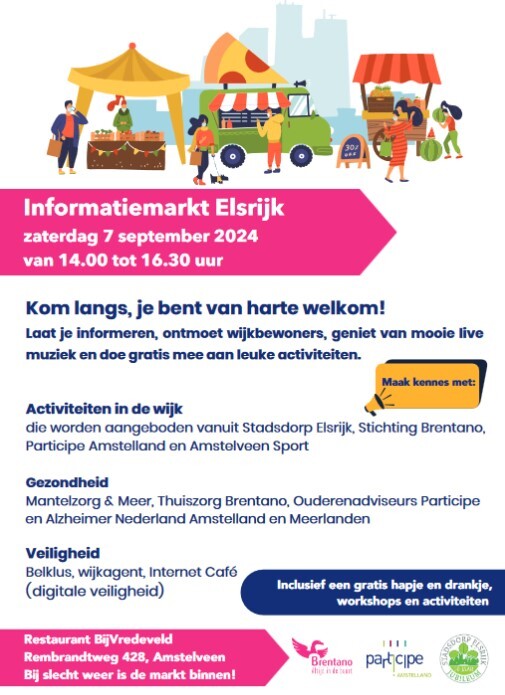 Zaterdag 7 september is er een informatiemarkt in restaurant BijVredeveld, van 14,00 tot 16,30 uur. Op deze middag zijn diverse organisaties door Stadsdorp Elsrijk uitgenodigd die wat gaan vertellen over Veiligheid, Activiteiten in de wijk en Zorg.