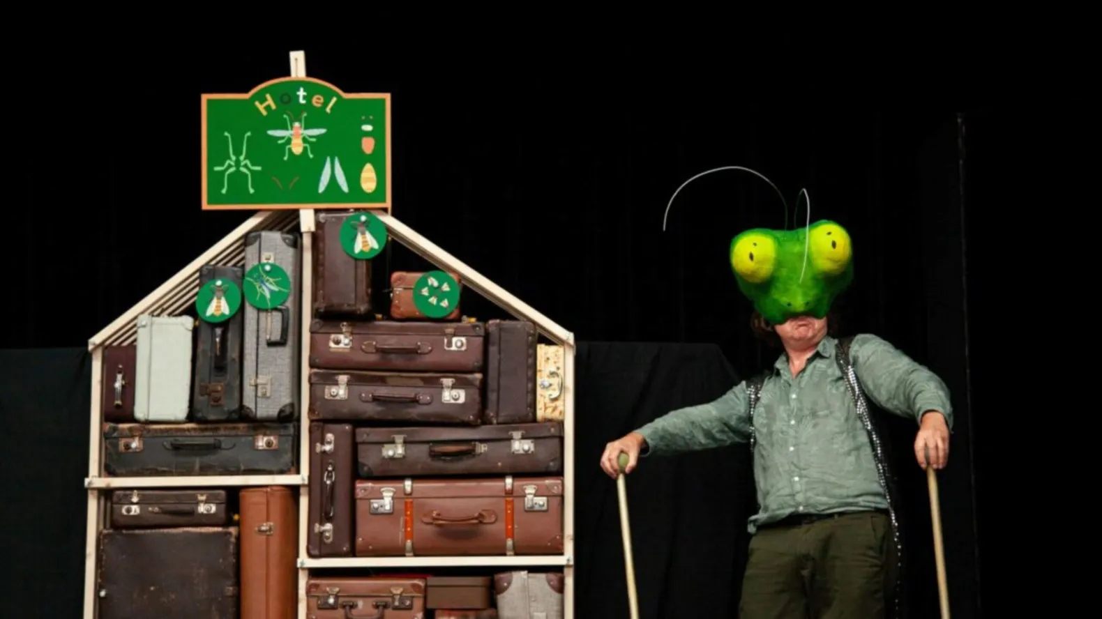 Insect en Hotel (4+) is een tekstloze voorstelling waarin de acteurs maskers en objecten tot leven laten komen. Kleurrijke maskers wervelen samen met kleine figuren door de voorstelling. Simpele objecten transformeren naar wonderlijke wezens: Een boek wordt een vlinder en een theedoek wordt een rups. Misschien maak jij wel van kwasten twee pluizige voelsprieten.