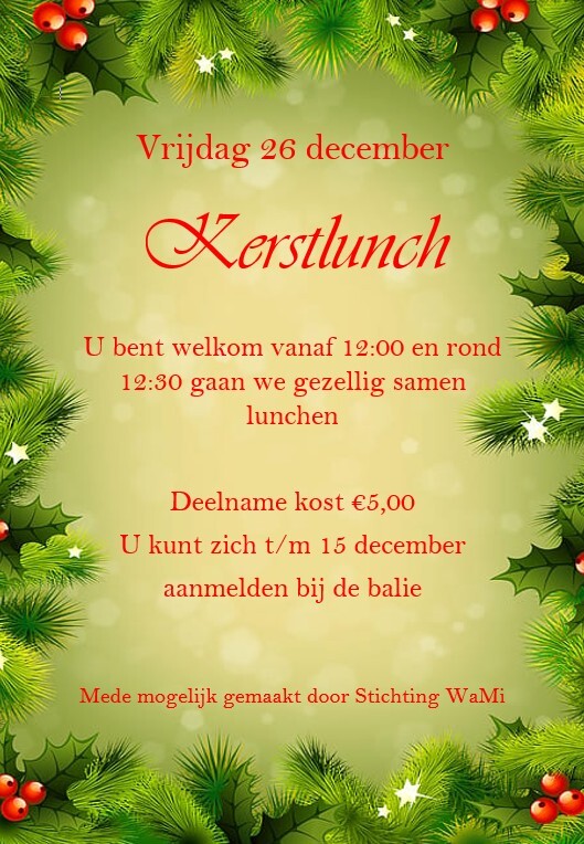 U kunt zich vanaf nu aanmelden bij onze balie. We zien u graag op 2e kerstdag