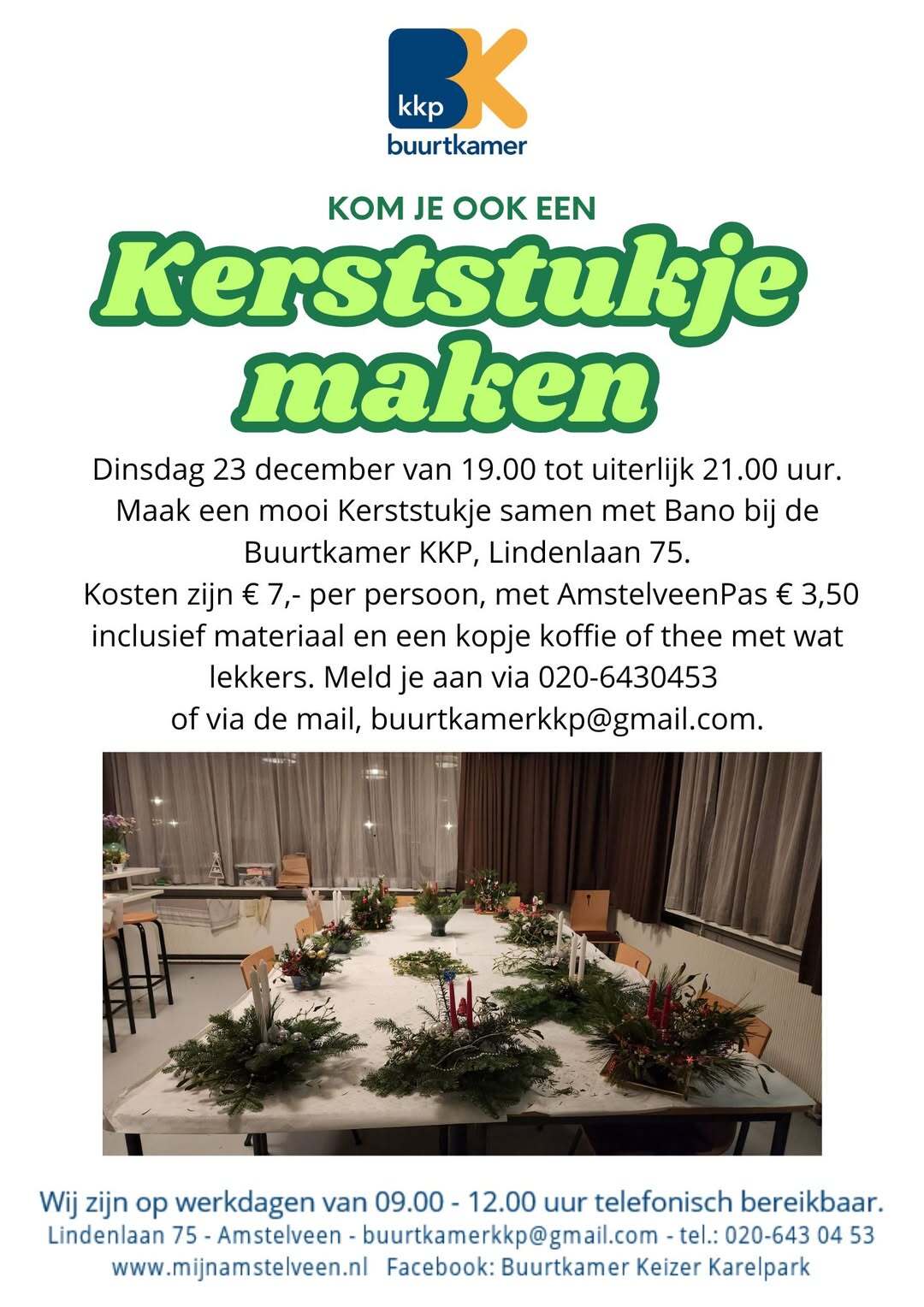 Maak je eigen kerststukje op dinsdagavond 23 december tussen van 19.00 tot 20.30 uur bij de Buurtkamer KKP (Lindenlaan 75) onder leiding van Tahira Bano.