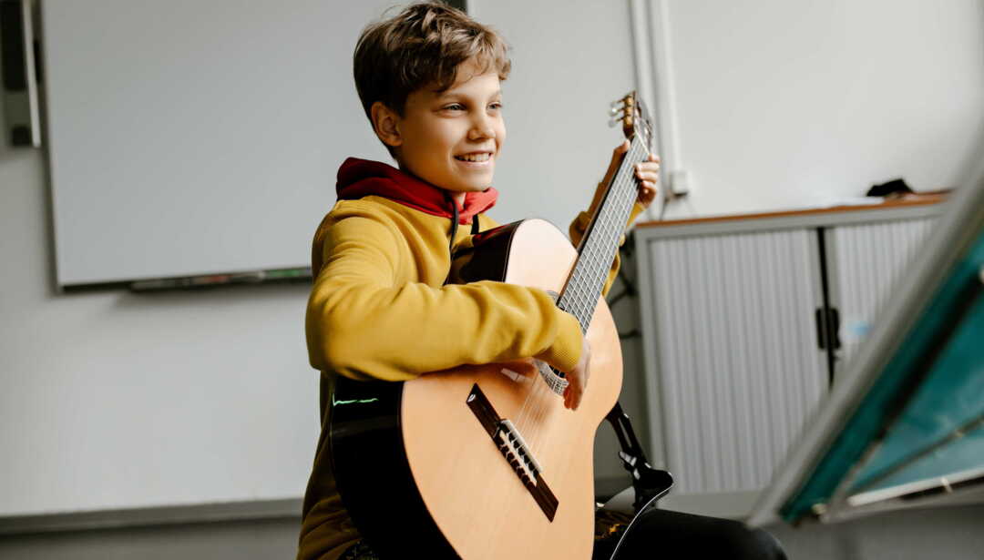 Tijdens ‘De Geluid Expeditie’ maken kinderen muziek. Ze spelen gitaar, zingen en bedenken hun eigen liedje.