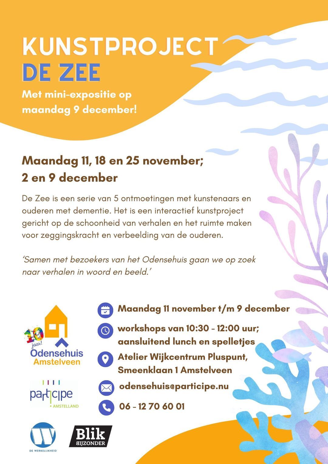 ‘De Zee’ is een serie van vijf ontmoetingen met kunstenaars en mensen met dementie en hun partners. Het is een interactief kunstproject gericht op de schoonheid van verhalen en het creëren van ruimte voor expressie en verbeelding. Iedereen kan vanuit zijn eigen perspectief een bijdrage leveren.