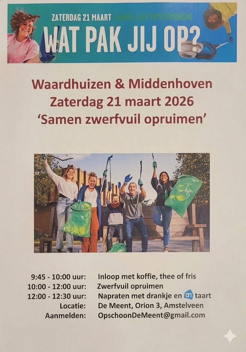 Landelijke opschoondag: zaterdag 21 maart; Komt u ook helpen de buurt weer schoon te maken, vele handen maken licht werk! Vanaf 9.45 wordt u verwelkomd met een kopje koffie, thee of een frisdrankje. Van 10.00 – 12.00 gaat u aan de slag. Om 12.00 uur kunt u weer een drankje komen drinken bij ons met een stukje taart.