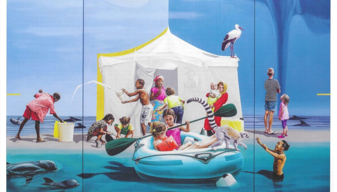 Bron: Conchita Willems Hierboven is de afbeelding van de Hongerdoek getiteld Samen dromen – Liefde zij daad. Deze doek maakte Konstanze Trommer uit de katholieke gemeenschap. In de doek weerspiegelt zich de door geloven in God gedragen hoop op radicale verandering van onrechtvaardige economische verhoudingen die veel mensen op aarde tot slachtoffers maken. En de hoop op een duurzame omgang met de natuur. Het is een collage van foto’s van bij ontwikkelingsprojecten betrokken kinderen uit Brazilië, Nigeria, Afghanistan, India en van kleinkinderen van de kunstenares. De doek wordt in deze gemeenschap gebruikt in de vastentijd van woensdag 18 februari – donderdag 2 april 2026 om zich te bezinnen op het verminderen van luxe vanuit wilskracht. Op het doek bevinden zich kinderen en dieren. Een vredig tafereel van gelukkige kinderen, omringd door zachtmoedige dieren? Die schijn bedriegt, want enkele kinderen moeten hard werken om water te halen of om een broertje of zusje te dragen op het eiland. Waarom vliegt daar een helikopter? Biedt de tent wel voldoende beschutting als het weer slecht wordt? Want rechts zie je toch al een tornado komen … Samen mens, medemens zijn, hier en nu. Met focus op hoe voor kinderen, voor elkaar en voor moeder aarde zorgen. Vanuit waarnemen, empathie en goedheid in onszelf. Liefde doet relaties veranderen — sociale, economische, educatieve, professionele, familiale, religieuze, juridische en andere. In gemeenschappen komt er door liefde een gevoel van gelijkwaardigheid. Waarbij gelijkwaardig zijn wat anders is dan gelijksoortig. Voor de hele mensheid geldt dit principe. Dat zet je aan het denken, ja toch? Mogen ik, u, wij ons bewust worden en blijven van dit principe. Laten wij werken hieraan! Link naar meer info over Hongerdoeken: https://www.kn.nl/verdieping/veertigdagentijd/hongerdoeken-weerspiegelen-al-50-jaar-de-hoop-op-een-betere-wereld/