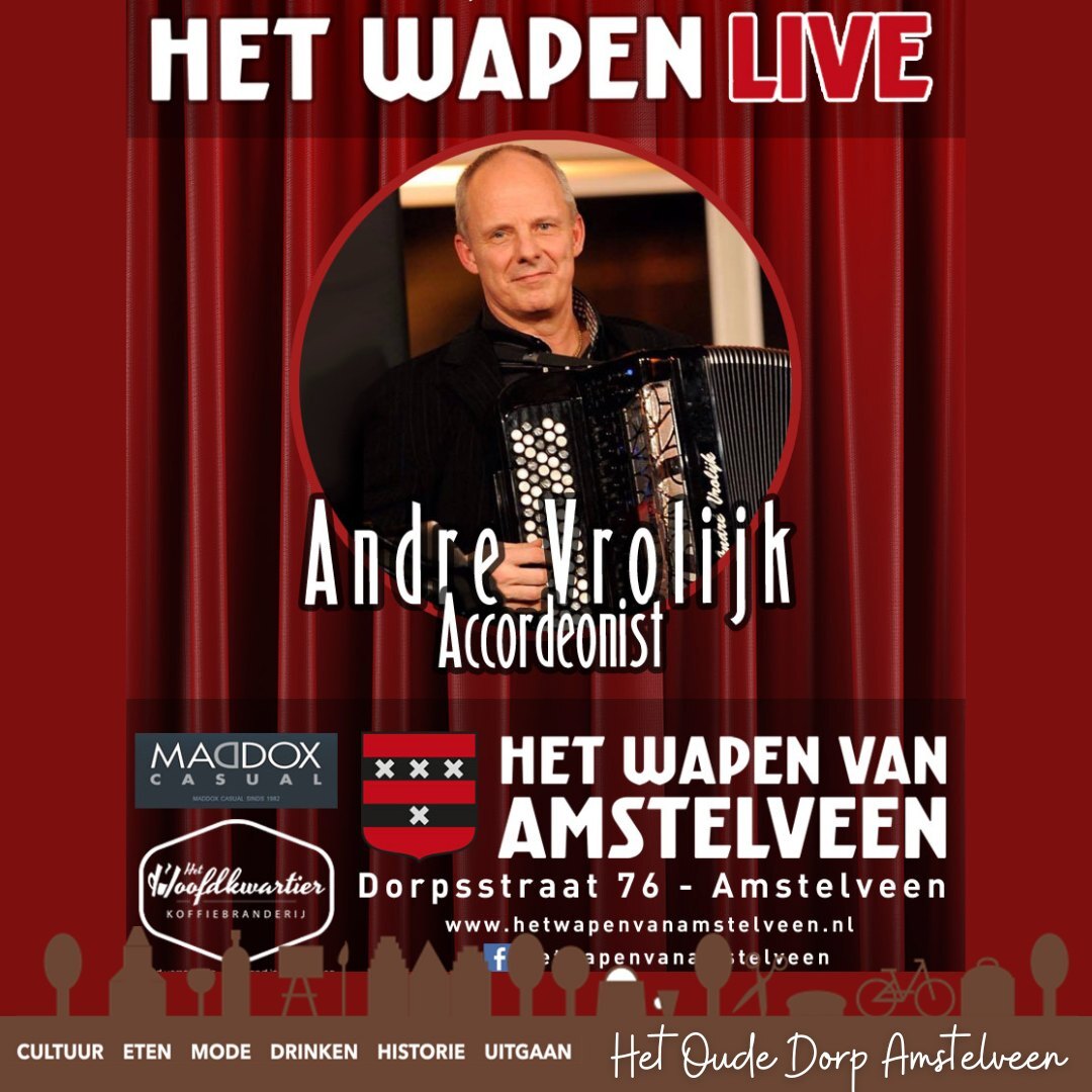 Vanaf 17.00 uur – al jaren de gezelligste zondagmiddagborrel van Amstelveen! Met natuurlijk live muziek van accordeonist & entertainer André Vrolijk.