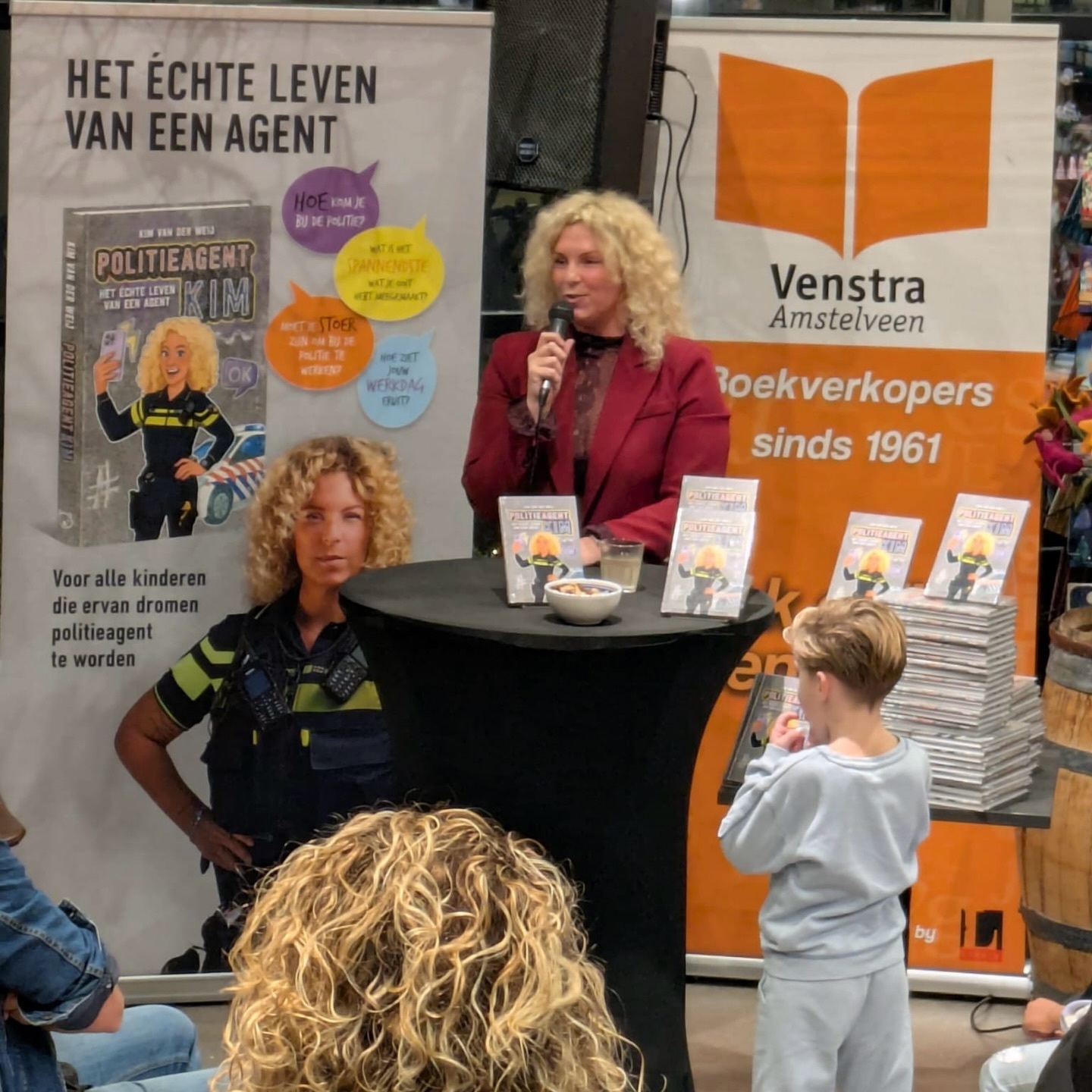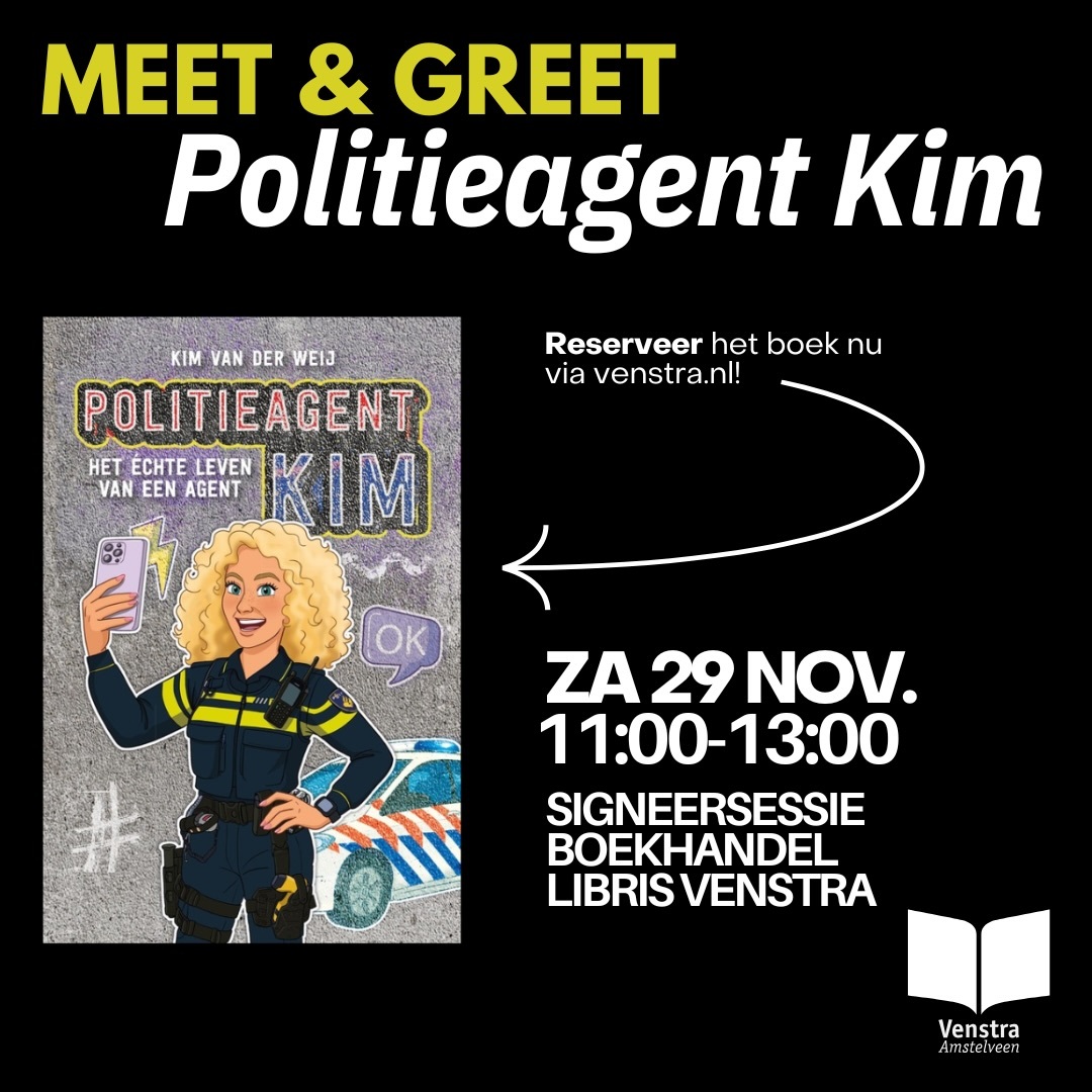 zaterdag komt jeugdagent @politie_kim_vd_weij bij Venstra langs voor een Meet & Greet! Je kunt haar kennen van sociale media, onder andere van TikTok. In haar kinderboek geeft ze een uniek kijkje achter de schermen bij de politie. Je komt erachter waarom en hoe ze politieagent is geworden.