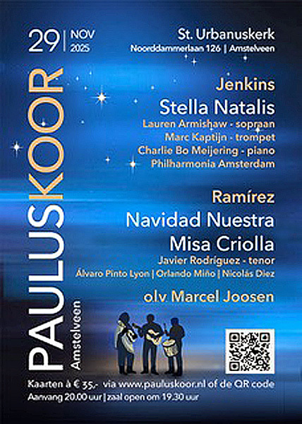 Op het programma staan drie werken die vooruitwijzen naar kerstmis. De Stella Natalis (2009) van Karl Jenkins en twee wereldberoemde composities van de Argentijn Ariel Ramirez: de Misa Criolla en de kerstcantate Navidad Nuestra (1963).