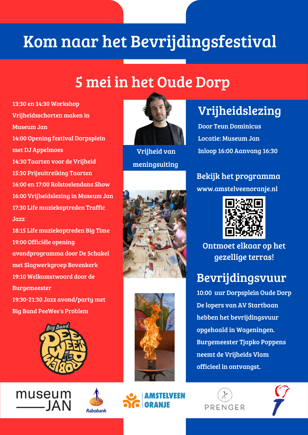 Bron: Amstelveen Oranje/H Op 5 mei 2026 vieren we met elkaar de vrijheid in het Oude Dorp van Amstelveen. Jong en oud komt naar het Bevrijdingsfestival voor een dag vol ontmoeting, muziek en activiteiten. Er is van alles te beleven. Bekijk het volledige programma op de website van Amstelveen Oranje. https://www.amstelveenoranje.nl/5-mei Een geliefd onderdeel is de bakwedstrijd Taarten voor Vrijheid. Thuisbakkers uit Amstelveen laten hun creativiteit én smaak zien met de mooiste vrijheidstaarten en cup cakes. Meedoen? Meld je aan via taarten@amstelveenoranje.nl. Voor wie verdieping zoekt, is er de jaarlijkse Vrijheidslezing. Dit jaar staat het thema 'vrijheid van meningsuiting' centraal. Een onderwerp dat uitnodigt tot nadenken en gesprek, en dat traditiegetrouw veel belangstelling trekt.Kinderen kunnen zelf aan de slag tijdens de workshop schorten maken. Hier maken zij hun eigen 'vrijheidsschort', een tastbare herinnering aan deze dag. Voor aanmelden ga naar de website van Museum Jan. https://museumjan.nl/activiteitenkalender Voor muziek en dansliefhebbers is er volop aanbod. DJ Appelmoes. Vanuit Platform C staan Big Time en Traffic Jazz op het podium, met een mix van jazz, pop en improvisatie. De Slagwerkgroep Bovenkerk en de Slagwerkgroep de Schakel openen het avondprogramma. Vanaf 19.30 uur wordt het swingen met de energieke Amstelveens bigband PeeWee's Problem . Met hun aanstekelijke combinatie van funk, soul en jazz weten zij ieder publiek mee te krijgen.Kom meevieren dat we 81 jaar geleden zijn bevrijd. Vrijheid is niet vanzelfsprekend.