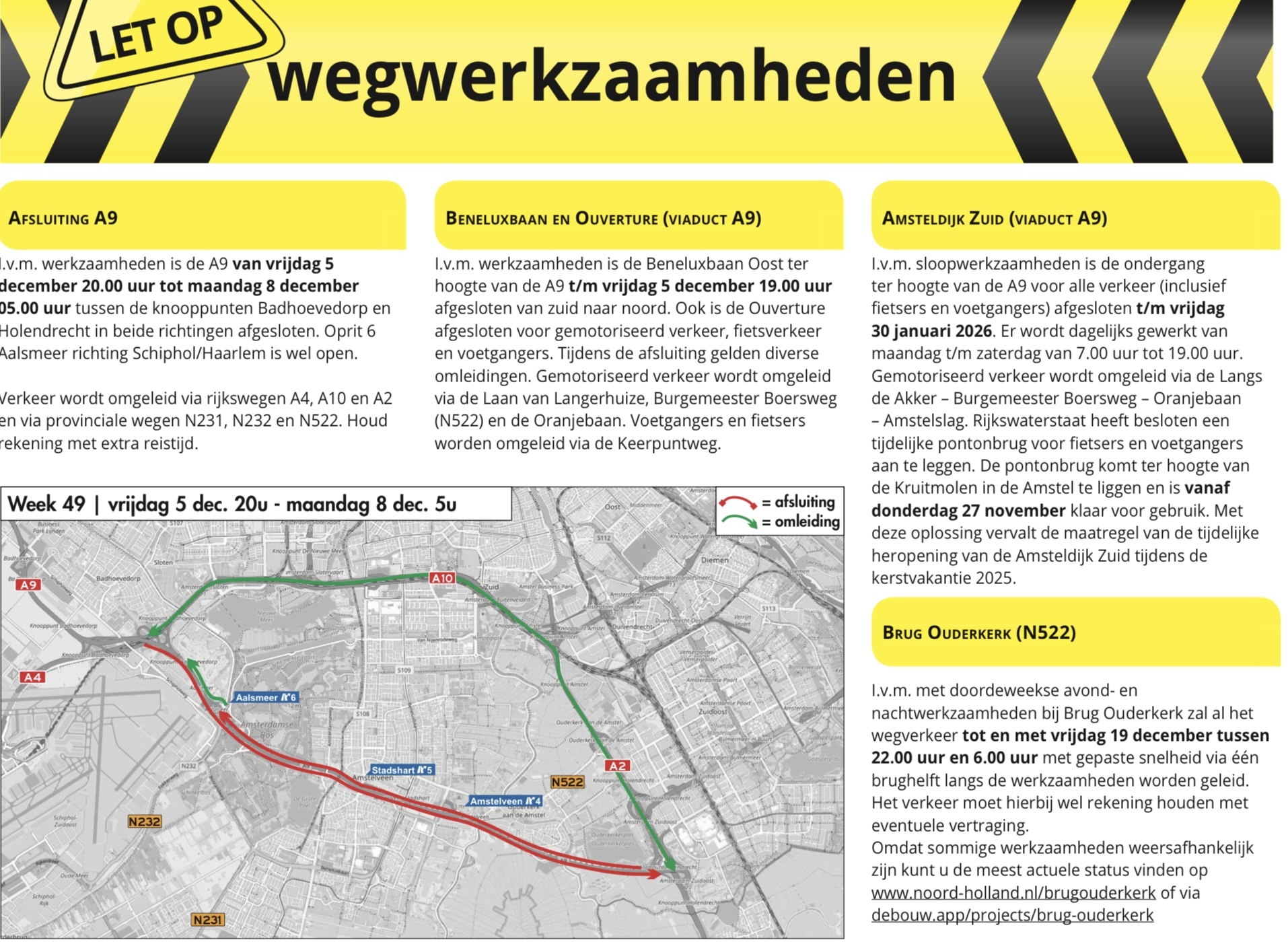 Van vrijdag 5 december 20.00 uur tot maandag 8 december 5.00 uur is de A9 afgesloten in beide richtingen tussen knooppunt Badhoevedorp en knooppunt Holendrecht. Verkeer wordt omgeleid via A4, A10 en A2. Houd rekening met extra reistijd.