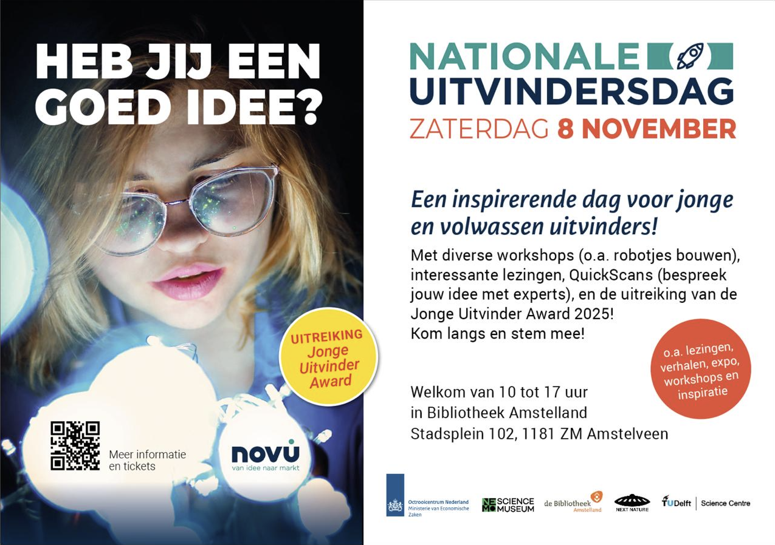 Wie verzint de uitvinding van de toekomst? Tien jonge talenten uit heel Nederland dingen mee naar de NOVU Jonge Uitvinder Award 2025. Hun slimme, grappige en duurzame ideeën – van een nooit-lekke binnenband tot de milieu-leuk-straat – zijn te bewonderen op de Nationale Uitvindersdag op zaterdag 8 november 2025 in Bibliotheek Amstelland, Amstelveen. Bezoekers kunnen die dag stemmen op hun favoriete uitvinding en helpen bepalen wie er met de prijzen naar huis gaat.