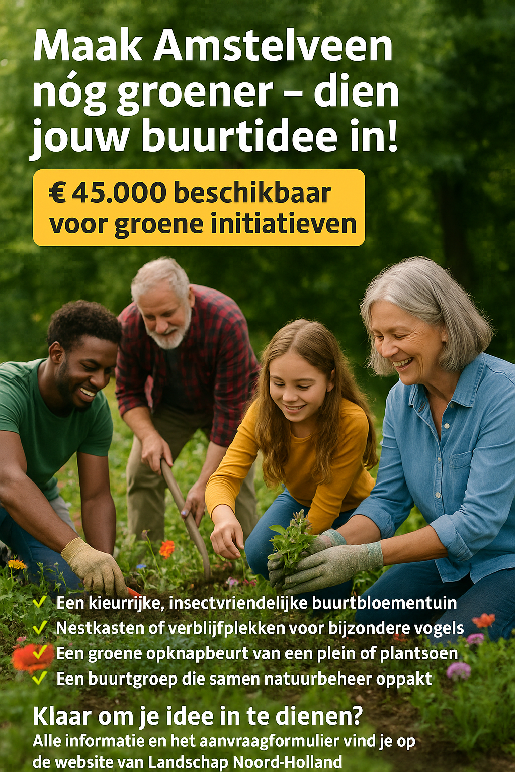 Bron: Provincie Noord-Holland/H Heb jij een plan om jouw straat, buurt of woonomgeving groener, mooier of natuurrijker te maken? Goed nieuws! De provincie stelt via het Betrekken bij Groen Fonds dit jaar € 45.000 beschikbaar voor groene vrijwilligersprojecten. En iedere Amstelvener kan meedoen. Wanneer kan ik mijn idee insturen? 📅 Van 5 januari tot 5 februari 2026 kun je jouw buurtinitiatief indienen en kans maken op subsidie. Wat voor ideeën maken kans? Alles wat Amstelveen groener maakt of mensen dichter bij de natuur brengt. Denk bijvoorbeeld aan: 🌼 Een kleurrijke, insectvriendelijke buurtbloementuin 🪶 Nestkasten of verblijfplekken voor bijzondere vogels 🌳 Een groene opknapbeurt van een plein of plantsoen 🤝 Een buurtgroep die samen natuurbeheer oppakt 🎒 Een educatief natuurproject op een basisschool 🐝 Of een compleet nieuw idee dat bijdraagt aan natuur, biodiversiteit of buurtbetrokkenheid! Kleine ideeën zijn net zo welkom als grotere projecten — als het de buurt mooier maakt, telt het. Waarom meedoen? Gedeputeerde Natuur Anouk Gielen benadrukt hoe waardevol deze initiatieven zijn: “Vrijwilligers maken met dit fonds écht impact. Samen versterken we de biodiversiteit én de band tussen mensen en hun groene leefomgeving.” Wie beoordeelt de aanvragen? De plannen worden bekeken door deskundigen van o.a. Staatsbosbeheer, Natuurmonumenten, PWN, het Amsterdamse Bos en andere natuurorganisaties in Noord-Holland. Klaar om je idee in te dienen? Alle informatie en het aanvraagformulier vind je op de website van Landschap Noord-Holland. Foto door AI