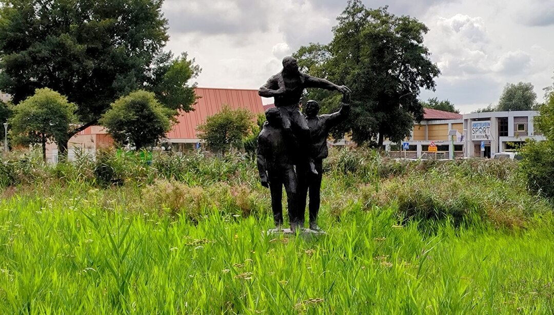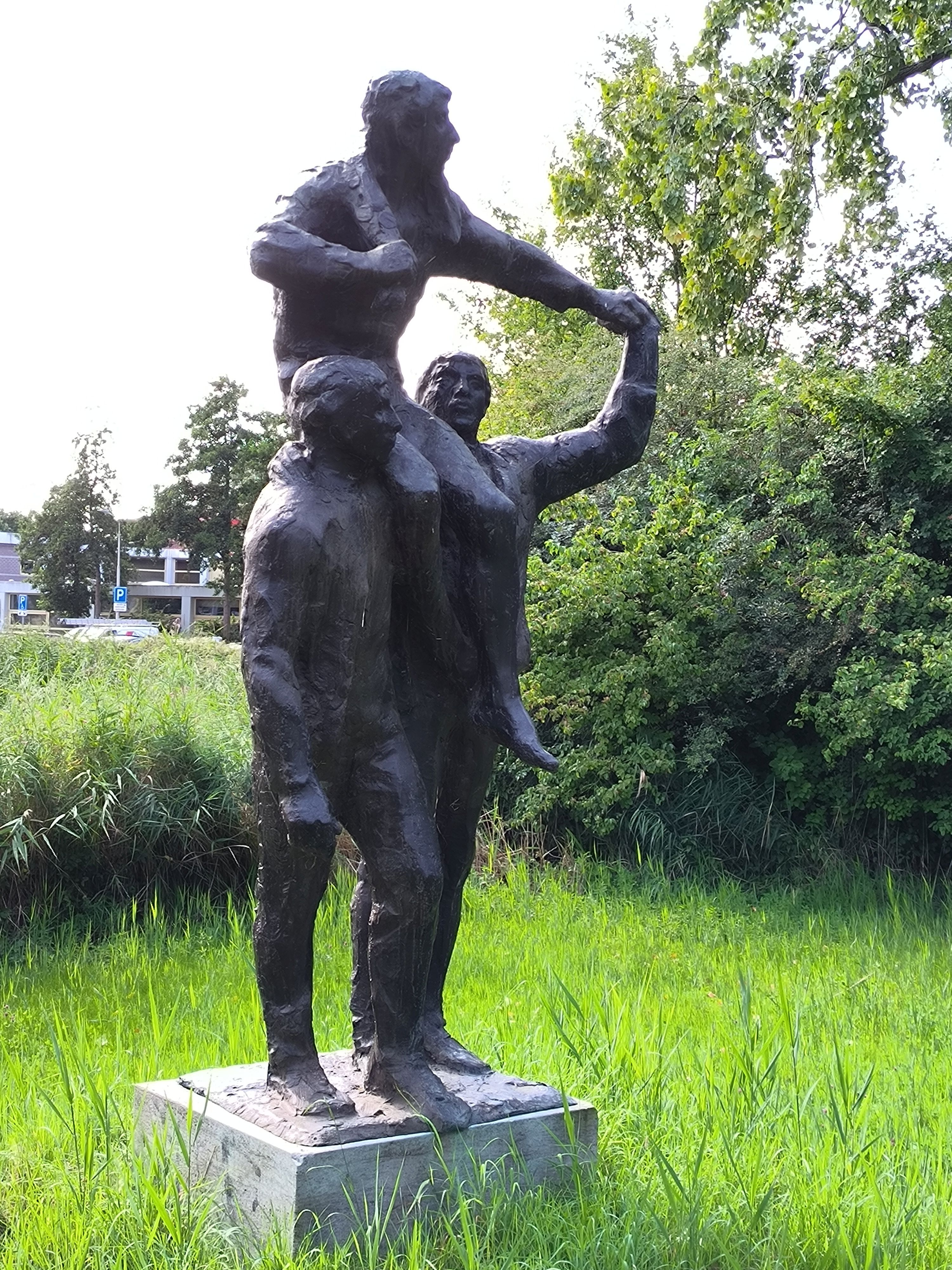Dirk Rijnders was van 1955 tot 1971 burgemeester van Amstelveen. Tijdens zijn ambtsperiode groeide Amstelveen van 10.000 naar 55.000 inwoners. Best iets om trots op te zijn en om een prestigeobject na te laten aan je gemeente. Maar ja, ‘de heroïek van de sport’ doet als thema toch wel aan de Duitse jaren ’30 denken. Begrijpelijk dat Eric Claus het beeld als een jeugdzonde ziet. Toch hoeft dat niet. Als je vanuit de huidige tijdgeest goed naar het beeld kijkt, is heroïek niet het eerste wat in je opkomt. Wat vooral opvalt, is de harmonie tussen de drie figuren: ze vormen gedrieën een eenheid. Je ziet dat ze kunnen samenwerken, op elkaar kunnen rekenen, elkaar steunen, elkaar aanvoelen. Samen kunnen ze een overwinning behalen. Dit beeld drukt teamgeest uit en past daarmee helemaal in onze 21e eeuw.