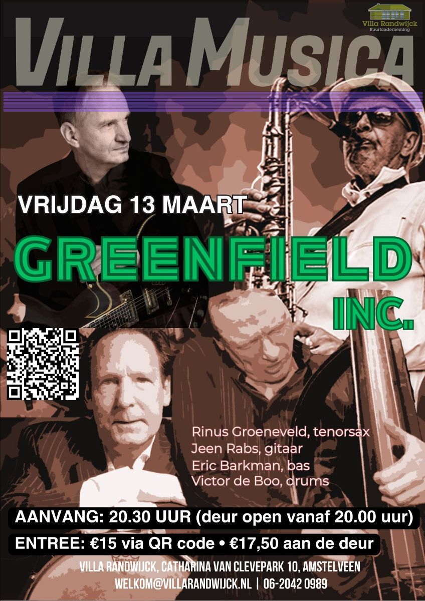 Bron: Villa Randwijck/H De voorjaarsvakantie is alweer in aantocht. Villa Randwijck is in de week van maandag 23 februari tot en met vrijdag 27 februari gesloten. Vanaf maandag 2 maart 2026 is het café weer open en gaan de activiteiten weer van start. Lezing in het ADC JAZZ IN DE VILLA: GREENFIELD inc. VRIJDAG 13 MAART Greenfield Inc. is de bruisende band van saxofonist Rinus Groeneveld en bassist Eric Barkman. De bandleden draaien al jaren mee in de Nederlandse jazzscene. Greenfield Inc. speelt sets vol onverwachte wendingen. Van groovy jazzhits tot Jimi Hendrix, van the Who tot unieke bewerkte popsongs. Lees hier de volledige Nieuwsbrief Villa Randwijck https://mailchi.mp/villarandwi...