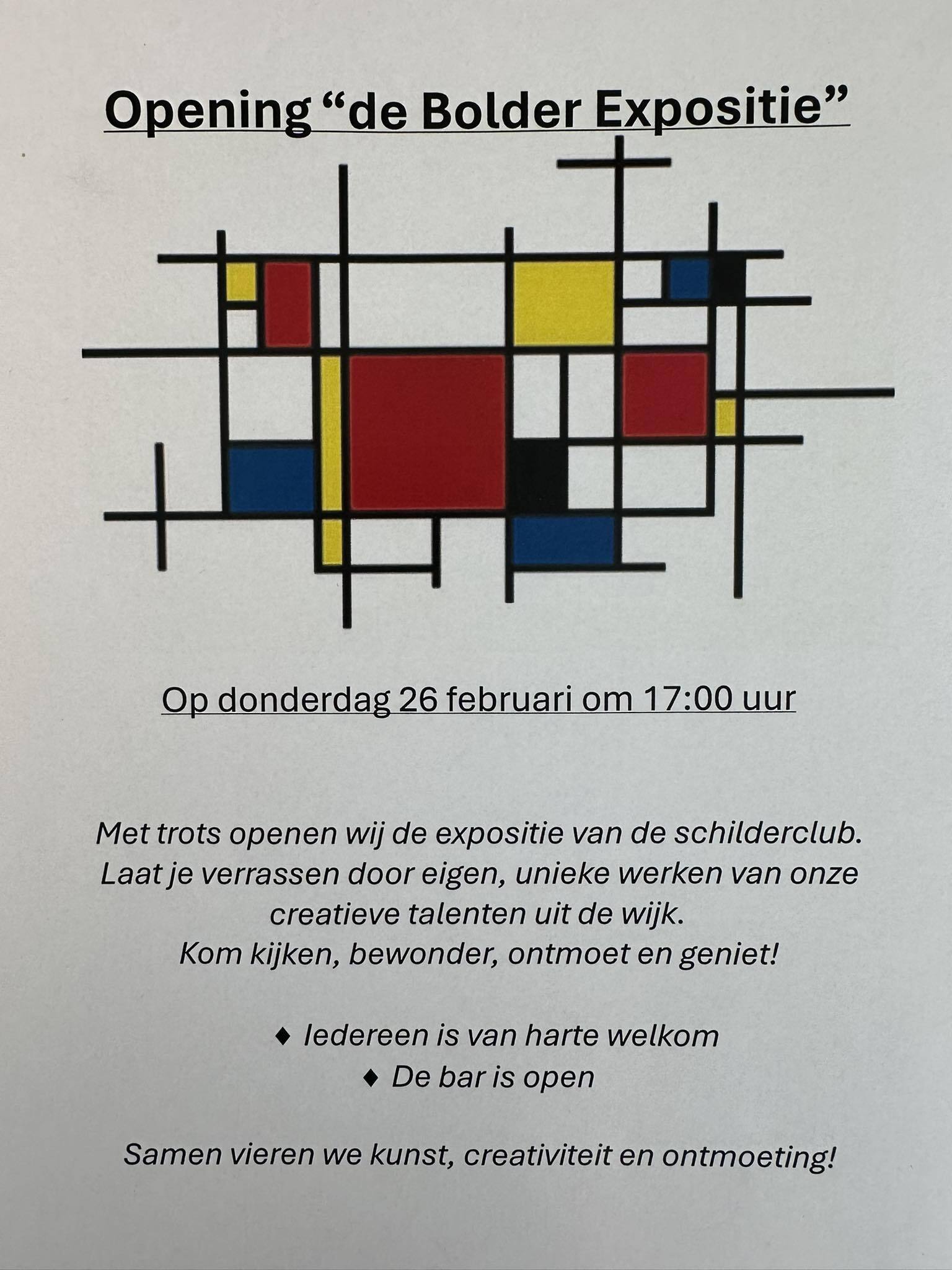 Expositie van unieke schilderijen van de schilder club in de Bolder! Op donderdag 26 februari 2026 om 17:00 uur