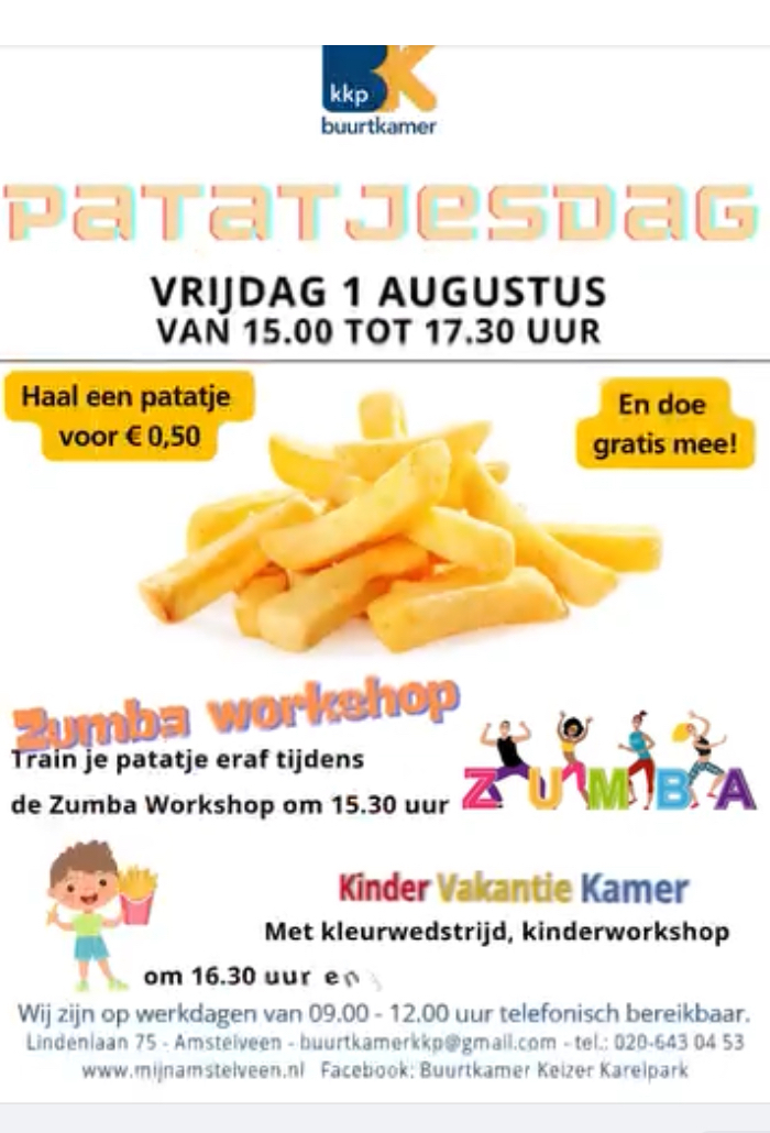 De Kinder Vakantie Kamer heeft weer een top middag. Op vrijdag 1 augustus 2025 is het Patatjesdag in de Buurtkamer KKP op de Nationale Frietdag van België.