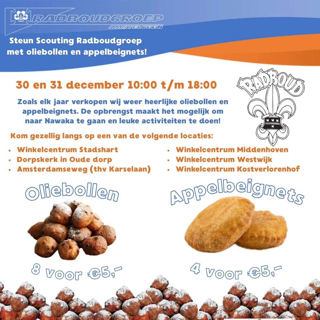 Bron: Scouting Radboudgroep Amstelveen/H Wie eind december de geur van versgebakken oliebollen ruikt, weet: het nieuwe jaar is dichtbij. Daar hoort in Amstelveen ook één vaste traditie bij: de oliebollenactie van Scouting Radboudgroep. Op zes plekken in Amstelveen – én op het clubhuis – verkopen leden van de Radboudgroep hun lekkernijen. Voor veel inwoners is het inmiddels vaste prik om langs te gaan: even bijpraten, een zak oliebollen meenemen en zo tegelijk een lokale vereniging steunen. Meer dan een oliebol De opbrengst van de actie komt volledig ten goede aan Scouting Radboudgroep. Met deze inkomsten worden activiteiten, materialen en boten gefinancierd, zodat scouting betaalbaar blijft voor kinderen en jongeren in Amstelveen. Betaalbaar én gezellig De prijs is al jaren hetzelfde gebleven: €5,- per zak. Daarvoor krijgen bezoekers acht oliebollen of vier appelbeignets. Daarmee is de actie een aantrekkelijk alternatief voor zowel de supermarktbol als de steeds duurdere oliebollenkramen, waar de prijs per stuk inmiddels ruim boven de euro ligt. Jaarlijks gaan er duizenden oliebollen en appelbeignets over de toonbank, verkocht door de leden zelf. Zo leren zij spelenderwijs samenwerken, verantwoordelijkheid nemen en contact maken met de buurt. Waar en wanneer? De kraampjes zijn op 30 en 31 december geopend van 10.00 tot 18.00 uur. Bezoekers kunnen terecht op: Wie het oude jaar goed wil afsluiten én een lokale vereniging wil steunen, weet dus waar hij moet zijn. Eén ding is zeker: zo smaken oliebollen nét een beetje beter. Volg de actie via de Facebookpagina https://www.facebook.com/p/Sco... Foto