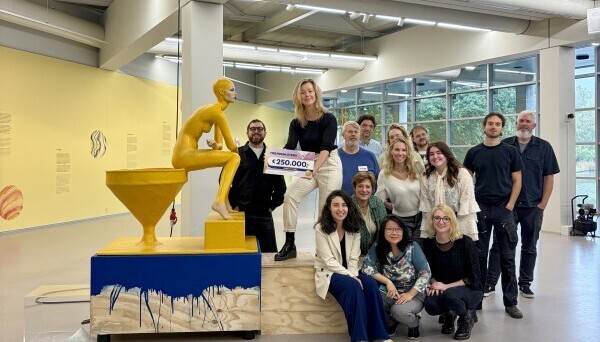 foto Museum Cobra ontvangt een cheque van de VriendenLoterij, gefotografeerd bij een werk van Atelier Van Lieshout.