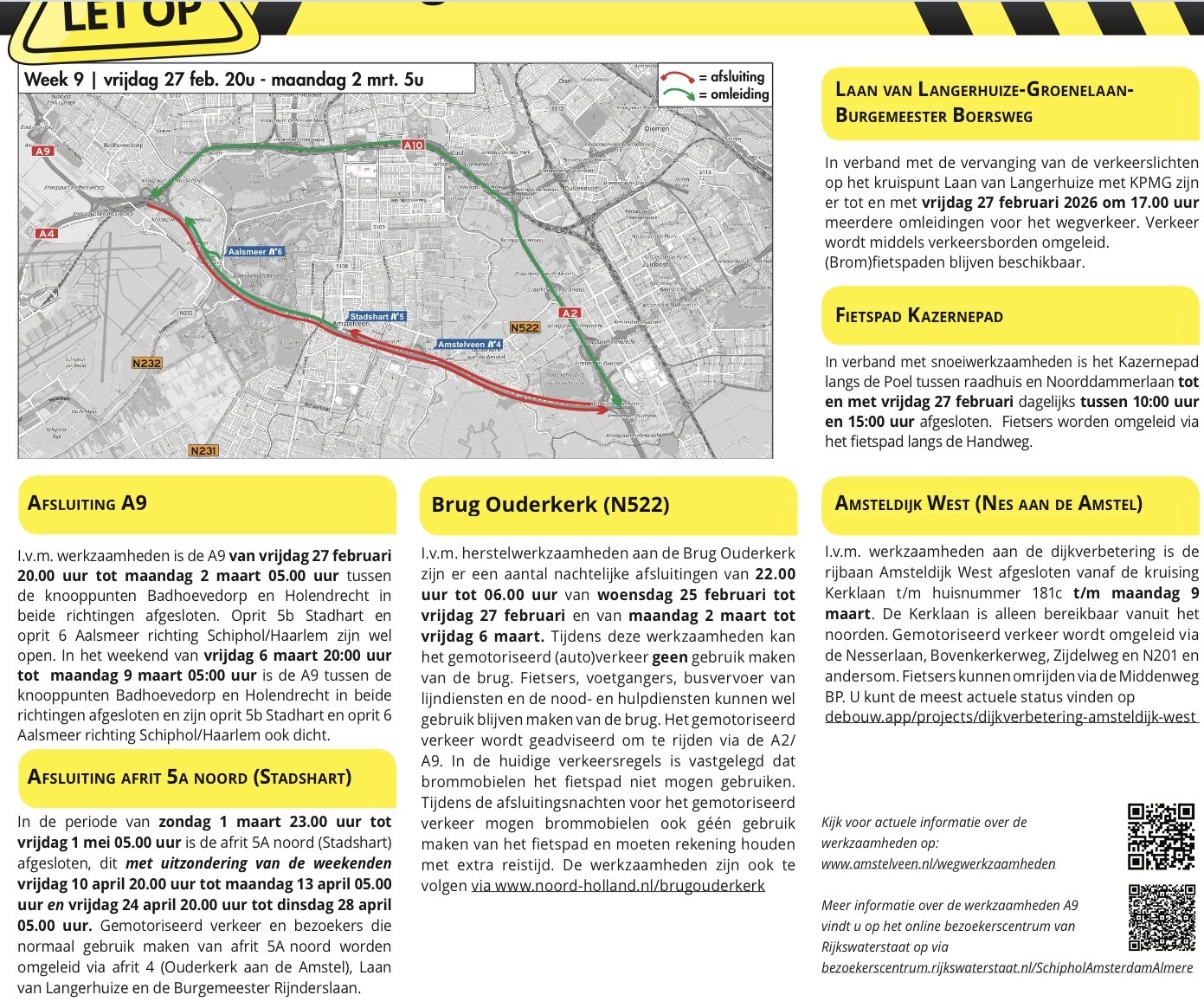 Bron: Gemeente Amstelveen/H Er zijn werkzaamheden aan de A9: vrijdag 27 februari 20.00 uur tot maandag 2 maart 05.00 uur tussen de knooppunten Badhoevedorp en Holendrecht is de A9 in beide richtingen afgesloten. Belangrijkste wegwerkzaamheden en afsluitingen (begin 2026): hieronder vindt u een overzicht van projecten en plannen. U kunt filteren op thema of wijk: https://www.amstelveen.nl/proj...