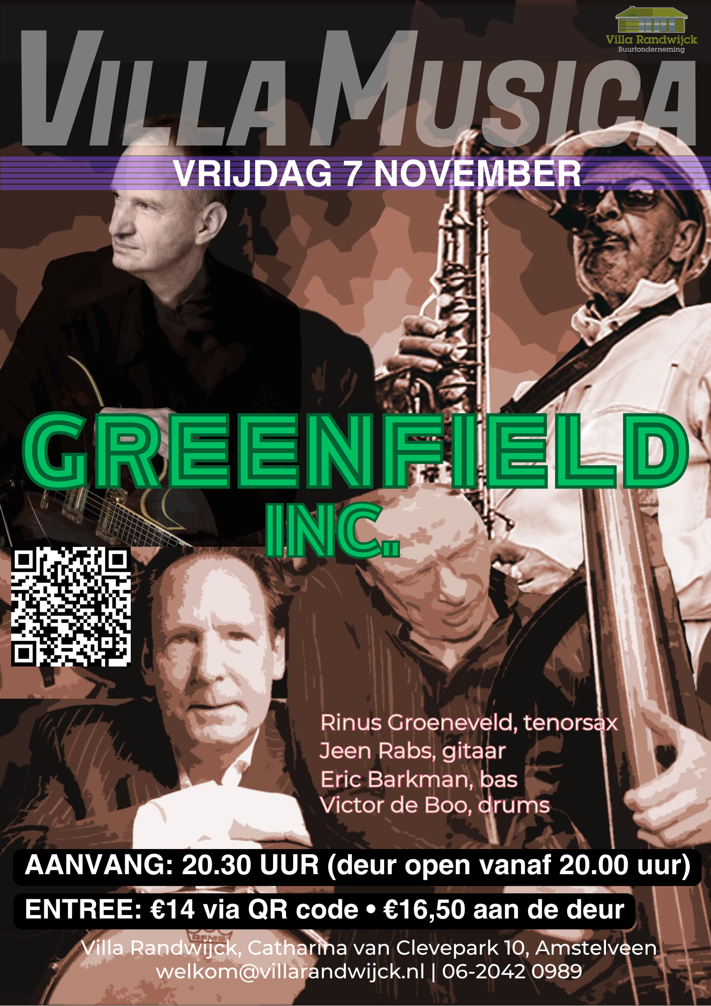 Greenfield Inc. is de bruisende band van saxofonist Rinus Groeneveld en bassist Eric Barkman. De bandleden draaien al jaren mee in de Nederlandse jazzscene.
