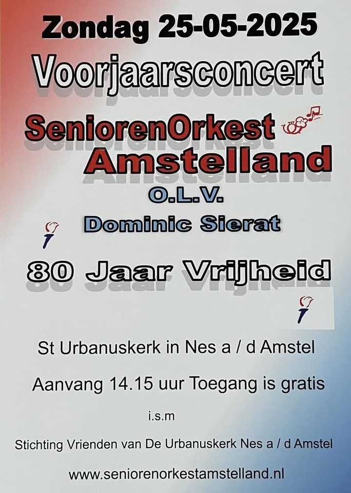 Op zondagmiddag 25 mei 2025 van 14.15 tot 16.15 uur verzorgt het Seniorenorkest Amstelland een feestelijk Voorjaarsconcert in de St. Urbanuskerk in Nes aan de Amstel. Het programma is zeer gevarieerd en bevat onder andere:
