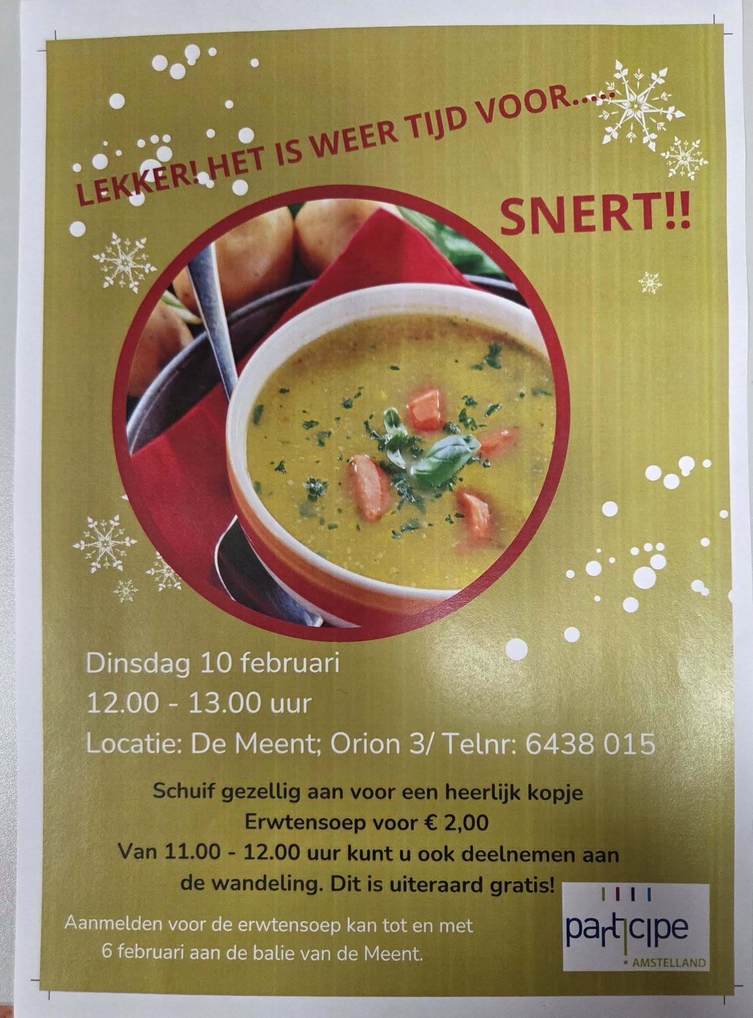 Eerst een lekkere wandeling van een uurtje en daarna erwtensoep eten. Of gewoon alleen maar soep eten! De kosten voor de erwtensoep zijn € 2,00 per kop. Graag voor 6 februari aanmelden (en betalen) bij de balie. We zien u graag!