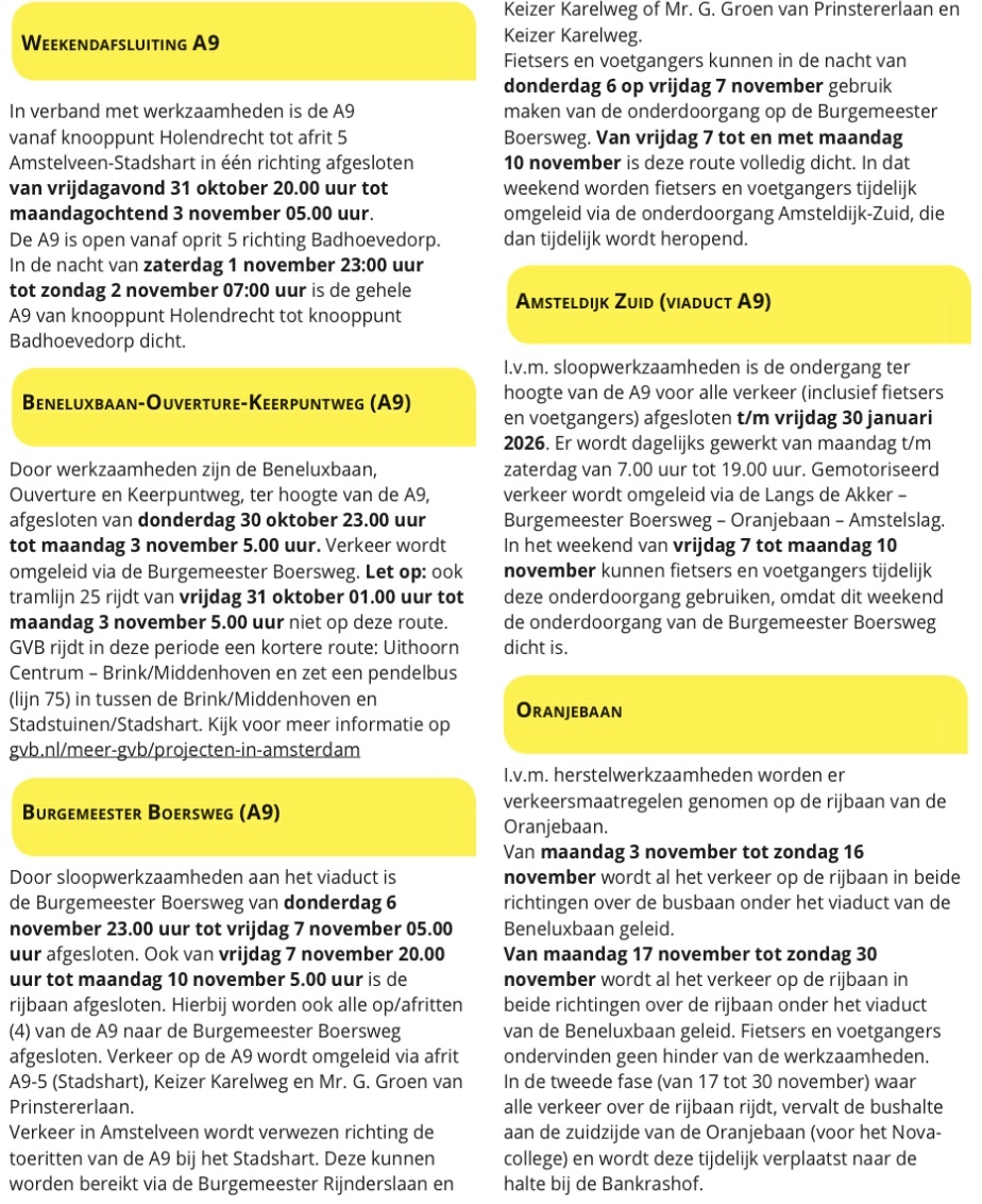 Van vrijdag 31 oktober tot maandag 3 november 2025 is de A9 (noordbaan) afgesloten tussen knooppunt Holendrecht en afrit 5-Stadshart. Rijkswaterstaat past in deze periode de weginrichting aan. Houd rekening met omleidingen en extra reistijd.
