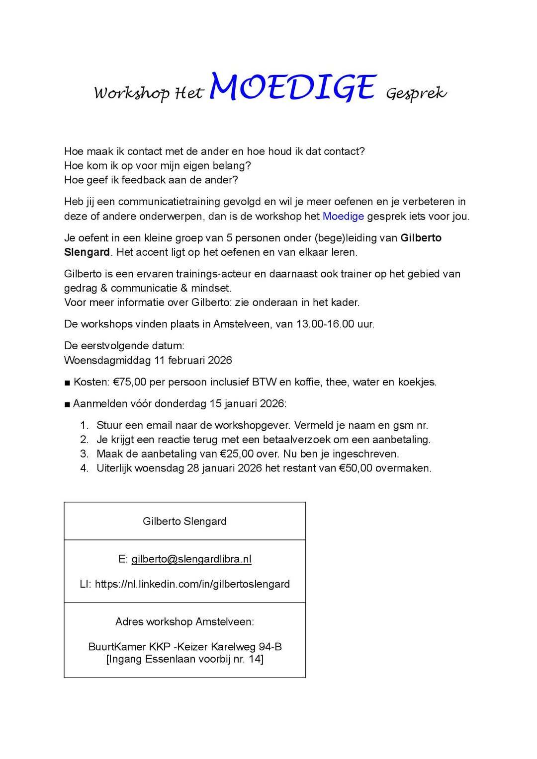 Workshop "Het Moedige Gesprek" verzorgt door Gilberto Slengard.op woensdag 11 februari van 13.00 tot 16.00 uur bij de Buurtkamer Keizer Karelpark in het gebouw van De Schakel, Keizer Karelweg 94BMeld je aan bij Gilberto